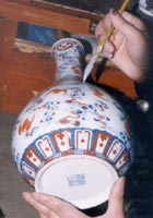 陶瓷艺术作品,有三种艺术风格:写实、写意、抽象。其中,抽象画由于形象模糊,很难使人接受,从事这种画风的人很少。陶瓷艺术作品以工笔和意笔为主要表现形式,釉上新彩、粉彩、古彩瓷画,以工笔写实为主,釉下青花、釉里红,则以写意画为主。 釉上彩工笔瓷画,看似容易操作,而实际上却需要经过较长时间的艺术实践,才能创作出精美的力作。在表现形式上,工笔瓷画以复杂的工艺绘制。线条,是艺术造型的重要媒介,以线造型是国画、瓷画的表现手段,工笔瓷画所采用的线条,有多种形式,即有国画“十八描”中的铁线描、游丝描、琴弦描,也有图案画的纤细线条,还有用细点组合而成的线条。线描的主要组合形式有两类:一是对物象的轮廓线经过取舍后,用简约的线条,表现物象的体积,质感动态。二是用夸张变形的线条来装饰绘画物象,线条的节奏感强。工笔瓷画线条的排列组合十分讲究,线条的长短、疏密、转拆,必须与形象密切结合,给人以流畅自如的印象。 细点:作为表现物象一种手段的细点,在工笔瓷画中,起到了衬托线条,补充画面的作用。 皴法中的雨点皴,米点皴中的皴法,以细点与线条结合,虽然工笔瓷画中较少运用皴法,但是细点在人物肖像,动物形象和花鸟瓷画中的作用是不可忽视的。在肖像瓷画中,不用国画中的线条,而且以浓淡、疏密的点组合成线条,这种线条,既是对人物形态结构的观察所创作出来的。又能更好地表现人物五官的质感。在彩瓷中的砂底斑点,有很强的装饰性。细点组成长、短线条与线条组合在一起,就有了块面的质感。 块面:任何物象的轮廓,给人的直觉印象是块面与线条形态,密集的细点,线条就成为块面体积,块面可用点、线组成,也可用颜料画出与点、线不同块面给人以整体的感受。人物,动物以块面形态为特征,植物中的树木、花卉、草丛、多以线条显现,也有块面形态,花瓣、叶片是块面,枝干、茎叶为线条形态。“雄风”新彩瓷画中,往往以深山中的猛虎为主题,它给人的印象是色彩斑斓的块面,而虎身上的条纹,又是以纤细的绒毛构成的。猛虎生存的环境中,有山峰、岩石,树木、草丛,这些物象又以块面,线条的形式出现。一件釉上彩工笔瓷画,往往都是由线条、细点、块面组合而成,作者的本领就在于能把点、线、面安排得恰到好处,不会给人以拼凑的生硬感。 色彩:色彩有单色、双色、三原色、五彩、七彩等多种形态。仅单色一类,就可以分成黑色、墨色、红色、蓝彩等。双色中的红绿色,在宋代就有盛名。五彩也称古彩,是釉上彩工笔瓷画中最早出现的品种。赤、橙、黄、绿、青、蓝、紫,是彩虹的色彩。在瓷画中,以七彩笔绘天下美景,就更能概括地