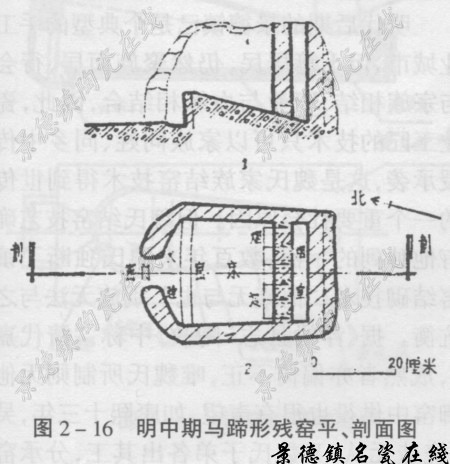 马蹄窑 马蹄窑与葫芦窑是景德镇湖田窑系中遗址的两种特殊的瓷窑,在明代生产芒口瓷。其形状方中带圆,下部大,上部小,很象马蹄下部的蹄甲。马蹄窑建造简单,投资少,窑炉较小,利于产品更新换代,有灵活求变,适应市场的优点。在景德镇湖田窑遗址,1977年清理。在乌泥顶发现马蹄窑(见图2—16),该窑为半倒焰式窑,长2.95米、宽2.5米—2.7米,坡度12.5°,东壁与后壁残高2.3米,有烟道6个,后烟室1个。该窑可烧瓷碗2000只左右。印证明嘉靖年间刊刻的王宗沐的《江西大志》“陶书”,其形制与王书所记之“青窑”相似。