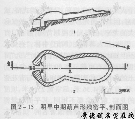 葫芦窑 葫芦窑出现于元代,沿烧至清代,《天工开物》(陶埏篇)插图显示明中后期景德镇葫芦窑图形,80年代初,曾在湖田古窑址中发掘出明代葫芦窑残体(见图2—15)。窑长8.4米,前后两窑,前宽后窄(3.7米-1.8米);前短后长形似葫芦,与《天工开物》插图相同。窑的前端设窑门和火膛,后室尾部建一独立的烟囱,窑顶两侧各设有6对投柴孔。整个窑底前低后高,坡度约为100,在一定的程度上保留了龙窑的遗风。在这种葫芦窑中焙烧瓷器,通常取以下方法:先将窑柴投入前室火膛,烧20个小时左右,然后将窑柴从投柴孔中投入窑内,续烧4个小时左右。葫芦窑实际上是一种半倒焰式窑炉,其优点主要为:由于烟囱抽力作用,使窑内压力基本处于零压或负压,窑内的温度和气氛都较容易控制。缺点是窑体较小(窑长一般仅8米—10米)容积不大,且前后温差较大。葫芦窑属民间窑场,到了明代,民窑之间互相竞争很激烈,资金充足的窑主就建大窑(龙窑、阶级窑),以便扩大产量,资金较少的窑主,则建这种窑体较小的葫芦窑,当年景德镇某些瓷釉中氧化钙含量少,粘度大,乳浊不透明的产品,别的窑难以烧成,但葫芦窑却能适宜烧成这种产品。按照王宗沐《江西大志·陶书》中记载,明代前期,景德镇瓷窑容积较小,“(色窑)制员而狭,每座只容烧小器三百余件”。与宋代龙窑相比,元明之间景德镇瓷窑容量已大大地缩小。