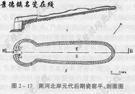 柴窑 因其形似半个鸭蛋复于地面,故称蛋形窑,又因其为景德镇独创,亦称景德镇窑,简称镇窑;由于所烧燃料为松柴故称柴窑,由于火焰前进方向较平,又称平焰式窑,或横焰窑;又因其酷似半个瓷瓮横卧于地,也称瓮形窑;因其正面外形颇系女人体型,故又称其为女体窑。元代以前,景德镇烧瓷盛兴容量宠大的龙窑,由于元代税制苛刻,窑主只有想法缩小窑炉容量,提高烧成率,才能减少税额。因此,元人蒋祈在《陶记》中称:“兴烧之际,按籍纳金”(“籍”在古代文献中可作容量解),不但如此,而且税制的执行十分严厉,“窑有尺籍,私之者刑”。在这种情况下,出现一种新型窑炉很有可能。在20世纪80年代初期,在景德镇南河北岸景德镇印刷机械厂院内出土的一座元代陶瓷焙烧卵白釉与青花瓷器的残窑,窑全长19.8米,窑壁残高0.6米—1.2米,前室宽4.56米,后室宽2.74米,坡度12°(见图2—17)。其形制奇特,和中国古代流行的龙窑、阶梯窑都不相同,其平面和景德镇还在使用的清代遗留下来柴窑(即镇窑)有某些相似之处,可见景德镇著名的“镇窑”在元代就已初具雏形,印证了清人唐英在《陶成示谕稿》中的说法。他在序中追述:“窑之高卑、阔狭、大小、浅深经夫火堂、火拭、火眼、火尾之规,种种不一,相继涌现,精其工,而供其役者,为景德镇魏氏专其业,而得其传,元明以来无异也。”