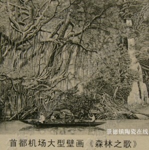 施于人的初稿。主题为“森林之歌”的壁画以云南茂密的热带雨林为背景,由色彩绚丽的瓷砖镶拼而成。这组壁画至今仍然装饰着首都机场。
