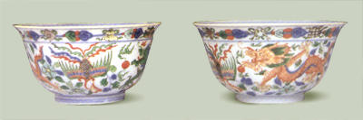 清代饮茶用杯,无论是釉色、纹饰、还是器型方面,都有进一步的发展。这里收录的几组造型、纹饰各异的小杯,以及色彩艳丽的五彩龙凤纹小杯(图217,右图)、造型清秀大方的青花釉里红花卉纹杯和青花团凤纹杯,体现了清代以来人们对文化、生活艺术的追求。