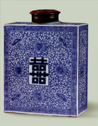 清代茶叶罐仍以瓷与紫砂器为主,形制多样,有方形、圆形、花瓣形等。从总体上看,器型有所加大,颈部有所加高,底部有圈足,平底。这里收录的造型挺秀大方的青花“喜喜”字方形罐(图245,右图),纹饰清晰流畅;造型巧妙、清新的粉彩“丰收”图罐,色彩艳丽而清逸,均为清代的常用茶具。