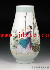 在装饰于法的创新方而,工艺与材质的突破创造了丰富多彩的装饰艺术语言。陶瓷传统工笔人物画,装饰于法比较单一而如今的陶瓷工笔人物画,虽然主题人物仍以工笔为主,但更强调主题人物的逼真,优美与作品意境的表现,画面主题人物装饰之衬景,表现则多讲究中国水墨色韵味变化,以酣畅笔墨,采用流,擦,点,染手法造就自然天成的只致。特别值得 提的是当代陶瓷工笔人物画把青花,粉彩,颜色釉,综合装饰等工艺与材质巧妙地进行有机结合,使陶瓷工笔人物画作品装饰色彩更加浓艳,画而更加亮丽,对比更加强烈,进入了新的绘画天地。如戴荣华创作的《秋趣图》瓷瓶,作品用高温釉里红画葫芦,用粉彩画顽童,两种材质技法互渗互用,丰富了其多彩的装饰艺术语言。又如舒惠娟的《醉春风》瓷瓶,作者以工笔粉彩画仕女,以中国国画技法点染牡丹,以极富墨色韵味变化的泼彩法画山石,这样多种材质技法相结合,使画面对比十分强烈,更加赏心悦。
