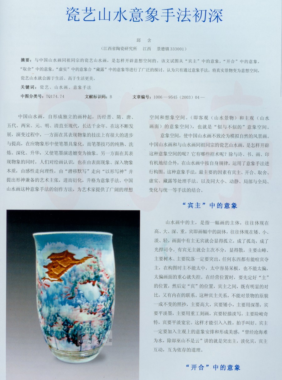 摘要:与中国山水画同祖同宗的瓷艺山水画,是怎样开辟意想空间的。该文试图从“宾主”中的意象,“开合”中的意象,