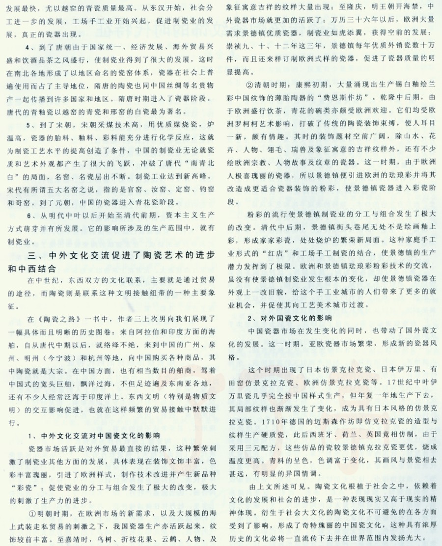 二、科技文化的发展带动了陶瓷艺术的发展提高 纵观中国历史,在漫长的封建社会里, 中国的物质文明史主要是农业和手工业的发展史。作为手工业代表之一的陶瓷业也在跟随社会的进步而不断发展。 1、在原始社会,工业种类很少,陶瓷业只有陶器制造部门。随着社会的进步和工业部门的不断增加,瓷器在商代开始。 2、从商周到西汉时期,我国的瓷器处在原始青瓷阶段,东汉晚期才烧出釉色光亮、质地纯净的青瓷。 3、魏晋南北朝时期经济重心南移,浙江地区制瓷业