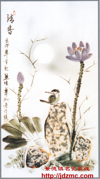 在抒情作品中,有的是赞美生活环境,抒发热爱现实生活的喜悦情怀,也有一部分内容是描绘忧愁哀怨,抒发淡泊情愫,表现高尚情操和文雅纯洁的品德。出现这样的艺术现象,主要是因为对美好生活的向往, 因政治制度的腐朽,许多有志之士怀才不遇,厌恶仕途,远避尘世。因此历代绘画与文学作品均以淡泊心态和隐迹山林的传统题材为多:如彩色瓷板画《看鹤图》继承了这一传统题材,瓷画上描绘一棵奇形树,一枝盘旋向上,一枝向左伸展横出颇具奇趣,一儒士右手抱琴,左手扶古树横枝侧身而立,仰看上空远去的云鹤,情思悠悠。画面诗曰: “抱琴看鹤去,枕石待云归”诗画之间,充满清幽高雅情趣, 抒发了抱琴人的淡泊胸襟和热爱大自然的情怀。陶瓷学院美术系陈列室中的《山居》瓷板画上部描画水天辽阔,远山淡影, 中部右方重山叠嶂,有一草亭及山下岸边斜出的大树,左方为河岸, 高石坪上建有三层楼台,伟岸挺拔。画面色彩鲜明, 图景清晰秀美、幽雅,正如画上题诗“山村楼阁两依依,渔樵耕读似仙居”各有所得各有所乐,称之为仙居实不为过。所抒发的正是对生活环境的热爱之情。