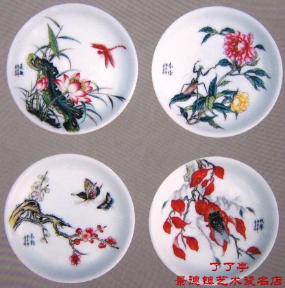 王鹤亭先生以画梅称著,2004年景德镇千年华诞之际,人民画报社授予王鹤亭先生“终身艺术成就奖”、 “当代陶瓷梅圣”、景德镇陶瓷美术界都尊称他为“梅花大王”。王鹤亭先生从事陶瓷创作六十余年,专攻花鸟虫草,尤以画梅见长。早在三十年代, 风华正茂年仅2 6岁的他, 历时三个月在三足香炉鼎上创作了《百鸟朝凤》画, 被当时国民党政府作为国礼赠送给美国总统罗斯福, 引起巨大轰动, 从此王鹤亭先生名声大噪。新中国成立时, 他创作的 "口平鸽嘉禾》画面装饰中餐具作为建国瓷。 1986年创作的大型瓷板画《梅花图》获全国工艺美术百花奖。为纪念毛泽东主席诞辰100周年,他创作了2尺瓷板画《红梅赞》, 为纪念刘少奇主席诞辰l 00周年,他创作了1.8尺瓷板画《铁首丹心》, 为庆祝建国50周年, 他创作了3. 6尺瓷板画《以介眉寿图》。王鹤亭先生有众多的作品流传于世, 《红梅吐艳》瓷板、《梅鹤争春》瓷板、 《暗香浮动》瓷板、 《江南春》文具、《江南春》圆盘、 《江南春》瓷板、 《红梅吐艳》圆盘、《梅花迎春》圆盘、 《梅花香自苦寒来》、 《梅鹤争春》、《罗浮香影》、 《迎春图》、 《梅松》瓷瓶、 《梅竹》瓷瓶、釉上彩《喜上眉梢》圆板、釉上彩"口平之春》瓷板、釉上彩《梅鹤精神》瓷板、釉上彩《淡桩艳骨花里神仙》瓷板。张松茂先生是中国工艺美术大师, 是1 98 8年4月第二批授予的, 是当时最早的3位大师之一, 是景德镇3 2名中国工艺美术大师、 中国陶瓷艺术大师中画梅较多的一位大师, 可以说是当代三大梅圣之一。作品有粉彩《白梅山水》山水瓷盘、粉彩《茶梅争春》瓷瓶、粉彩《茶梅》瓷瓶、粉彩《茶梅迎春》瓶、粉彩《和靖咏梅》、 《红梅》瓷瓶……等。