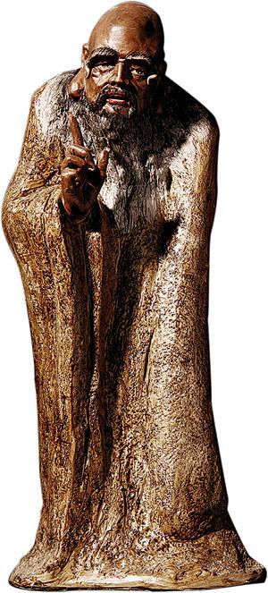 笔者大学毕业以后一直从事雕塑创作,而且特别喜欢从中国传统的古代文化中吸取养分,寻找创作的灵感,也特别喜好传统的中国文化。在大学特别喜好上的文化科就是大学语文,中国传统的文化确实博大精深。如92年创作的被日本“恩巴中国近代美术馆’收藏的“寒江独钓”,它同时也入选了《中国现代美术全集》(卷三),就是取材于唐宋八大家之一的柳宗元的《江雪>>.当时就想,日本人是崇尚汉文化的,特别是唐代文化,直到今天,其影响仍然有迹可循。2005年我创作了一批中国古代的文化先哲的瓷雕群像,“大江东去一苏东坡”、“孑L子”、“采菊东篱下悠然见南山一陶渊明”、“举杯邀明月一李白”等,本文所介绍的“老子一天人合一”是近期颇具影响的作品之一。