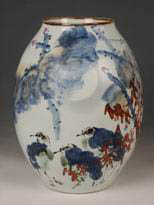 写意花写画的笔墨是高度简练概括, 发挥其“意到笔不到的”作用,齐白石画虾不画水而感到虾在水中游。八大山人寥寥几笔荷梗荷叶而使读者有身临池边的感觉。 以少胜多, 简练概括而寓意深刻是写意画特别强调的又一特点。陶瓷绘画不同于纯粹的中国画, 它是一门工艺性很强的陶瓷艺术表现形式。在进行陶瓷艺术绘画创作时,它既要照顾到中国画的美学要素,而且又要符合其工艺特性,它的一切艺术美感最后都要通过“火”来实现,也就是“泥与火”的结晶。 同时不同的造型也决定不同的绘画装饰, 陶瓷的造型有平面和立体两种类型,平面的造型有如纸的特性一样可以进行独立的纯绘画创作表现, 这时与一般的中国画本质相同,最终作为一幅画供人们欣赏。陶瓷绘画同中国画的不同除材料和表现技巧外,更大的不同多是在立体的三维空间上进行装饰,这时进行作画装饰必须考虑艺术形象的塑造是否符合陶瓷的外形美。在陶瓷造型不同的角度塑造不同的形象,但彼此又相互关联和协调,共同构成一个整体的美。这时它所呈现出来的美感不是平面的表现所能达到,它所展现的是独特瓷的质地美、造型的形体美、绘画的装饰美的综合体。