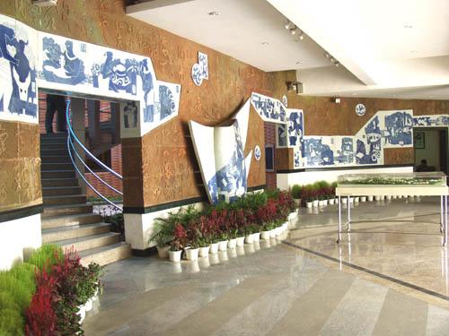 了了亭 景德镇陶瓷艺术馆 资讯 本文刊发于《陶瓷研究》:如今,环境陶艺以丰富的二维、三维模式进入校园环境空间当中,如陶艺壁画、壁挂、现代陶艺等。在美国Alfred university的校园内有一处墙壁,陶艺家们运用陶艺的手法创作的这面陶艺墙,表述了作者对校园环境特点的审美理念,使得在这一场所更显轻松和个性。此处陶艺墙作品面貌充分显现了作者借用陶瓷材质与人的天然亲和力的创作智慧,进而提升了校园内环境的品位。在景德镇陶瓷学院是以柱形建筑物的形式所展现,在院内红楼前i几组高大的陶艺柱子,陶艺家利用陶瓷材料的一系列特有的工艺特点,在色彩的运用上,注重与固有环境色彩的相谐调。虽然陶柱的组合设计强调静中有动感,但从整个环境色调来说,鲜明的还是主环境中凹字楼的红色和陶艺中心大楼的咖啡色,东边的逸夫教学楼的一种淡灰色调使整个主体环境有一个出“气”之道,面北的绿色树林造就了一片生机,并以色度渐变的效果区别周边整齐划一的规范色调的运用,既和陶柱的静动结合的十分有趣,又和周边色调谐调成章。