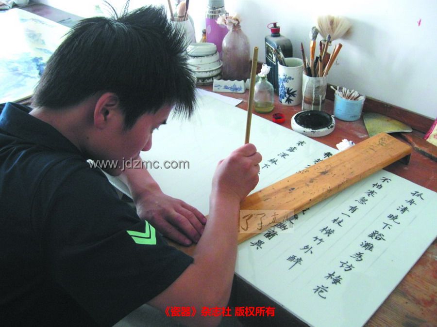 瓷画题款的形式也和国画一样多种多样,随着时代发展, 当代人对瓷画的欣赏角度已同古人相去甚远, 最大区别莫过于对题款的漠视。这既有知识结构古今不同的原因, 也有西画欣赏方法的影响。当代瓷画题款只有标题、作者姓名与创作时间受到一定的关注, 其他内容即使同行也不一定逐字逐句细读观赏。无论作者还是观众, 部长期没有发现当代瓷画的题款已问题多多。问题主要表现在以下几个方面: 一是题款书法欠精,但还能自己题写画名、干支年款和作者姓名;二是不懂书法请人代笔题写画名、千支年款和作者姓名; 三是不该题的位置乱题, 龙飞凤舞喧宾夺主又不知文字所云: 四是标题出现错字、 自撰词汇以及常识性错误:五是题款文字舛误,文句不通, 辞不达意,乱用或自造词汇;六是自制诗问题多, 诗意理俗, 措词多有不通, 平仄格律错误严重;七是抄摘前人诗文语录, 自己不能措一词等等。