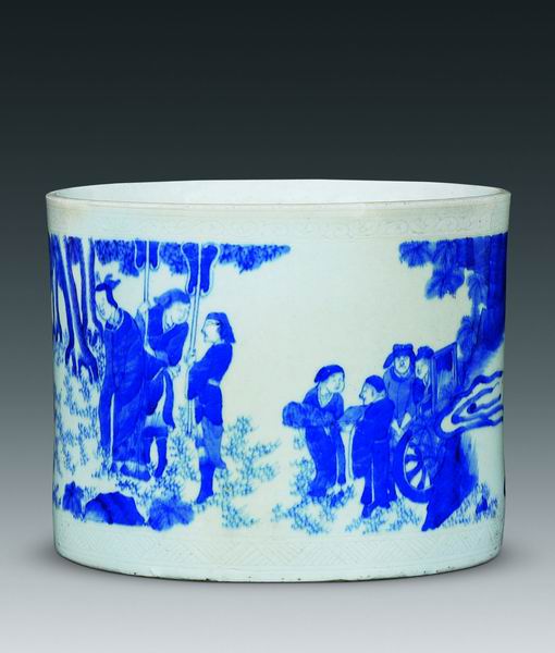 第三,工具和技艺的发展进步。晚明时期陶瓷绘画的工具、技术和技法已经能够充分自由地表现山水纹饰。成化时出现“分水”技法,用鸡头笔(一种画青花的工具,类似于毛笔)沾青花料在坯胎上分成深浅不同的多个色阶,这和传统中国画中的“墨分五色”有异曲同工之处,坯胎相当于宣纸,青花料相当于墨。 “分水法”的出现并发展成熟是青花山水大量出现并且能够画地好的技术性因素。