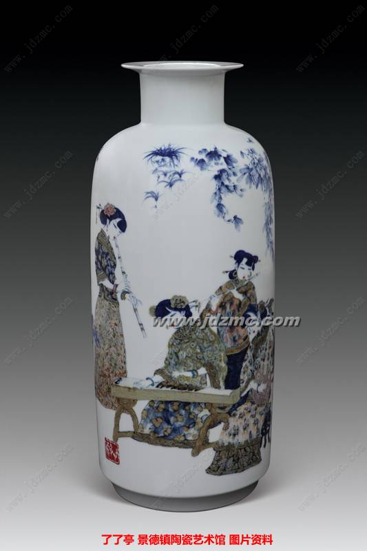在现代陶艺中最具绘画形式特征,且从继承和创新的角度来看最为成功的,当属现代民间青花笔绘。从景德镇陶瓷学院秦锡麟教授的作品来看,显然是将古代民间青花的构成形式于现代陶艺的造型意识结合在一起,打散了传统的模式而体现了极强的创新思维。《早春》并不是按自然形态去摹写茶花的枝叶,而是利用青花沁润大胆地处理成几个抽象的色块肌理,再用纵横线条进行刻划,枝条则绘成极有韵律感的弹性细线,与釉里红的花,青花的叶穿插联接,形成了点、线、面基本造型元素构成的节奏变化。同时器型上也打破了同心圆的传统程式,瓶口以自然的扭曲产生动感,下部保留了明显的手工拉坯的纹理。这些自然意识的流露,使主题的表现更加深化,更具有浓郁的人情味。