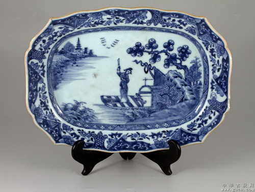 渔舟唱晚,也是乾隆时期渔民生活的一个小缩影。如乾隆豆青地青花山水人物盘,江舟之上,渔民立于船头,弯腰撑篙,似乎捕获的大鱼压满了船仓,使得船体加重,愉悦满足的心情由此可见一斑。江景掩映在古树山崖之侧,给人宽阔的空间感和立体感。远景水天一色,明月初上,中景渔舟唱晚,近景古树参天,枝丫茂密,芦苇汀滩。布局合理有序,比例准确,凸显出自然山水的灵性,青花浓艳,皴擦点染,法度严谨。