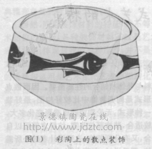 陶瓷装饰贯穿于陶瓷的制作全过程,被表现在一切陶瓷材料上,从坯料、化妆土、釉料和彩绘颜料等。因而陶瓷装饰形式很多,很丰富,散点装饰形式就是陶瓷装饰中的一种处理手法。其实,散点装饰形式早在几千年的新石器时代就被祖先用于装饰在陶器上。(如图一)但散点装饰形式并非陶瓷装饰“独家经营”,在当时兄弟艺术中像青铜器,漆器,纺织品等都常采用。作为陶瓷散点装饰形式它具有独特性。它必须经过工艺,材质,烧练等工序过程,并依附在一定造型之上,运用工艺手段产生形成。我们从许多陶瓷作品中看到,把不同性质,不同时间地点的物象,不同类形的物象,巧妙组合在一起,形成了一个多姿多彩的画图。形成一种对比协调的艺术效果。这就是散点装饰形式的特点之所在。笔者因在陶瓷美术领域从事创作设计工作多年,根据自己切身体会。谈谈散点装饰形式的技法及特点与同行们共同探讨。