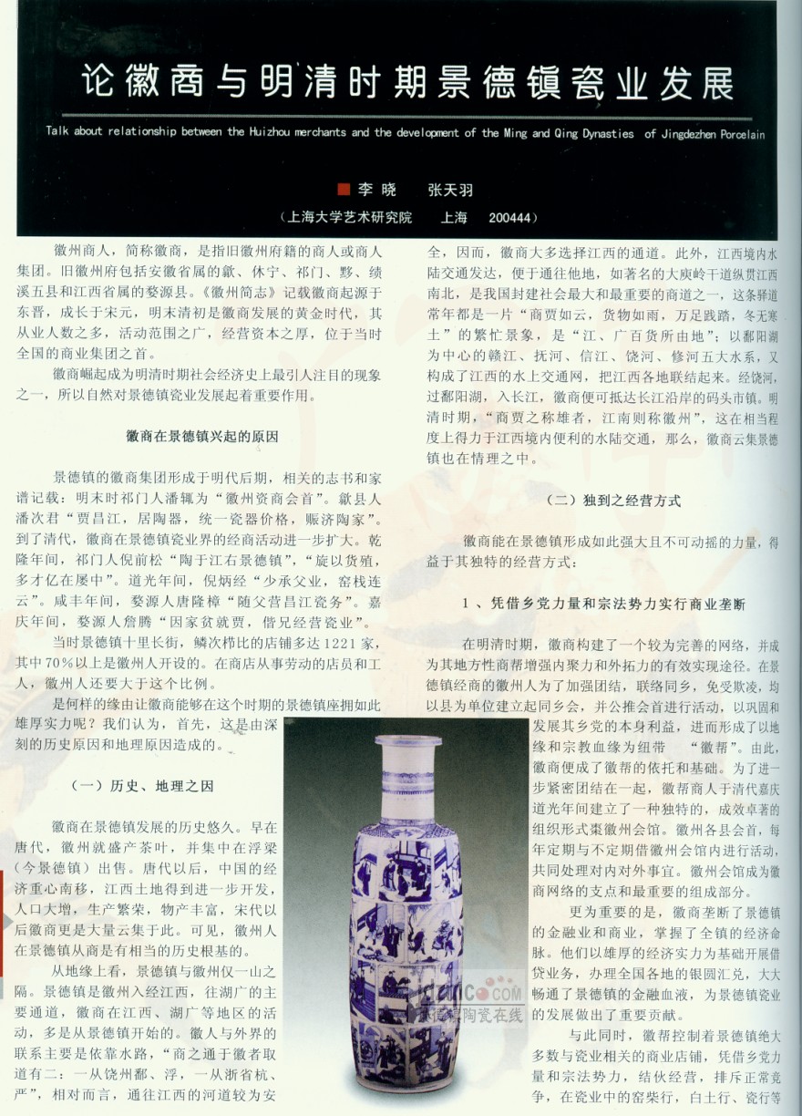 徽州商人,简称徽商,是指旧徽州府籍的商人或商人集团。旧徽州府包括安徽省属的歙、休宁、祁门、黟、绩溪五县和江西省属的婺源县。《徽州简志》记载徽商起源于 东晋,成长于宋元,明末清初是徽商发展的黄金时代,其从业人数之多,活动范围之广,经营资本之厚,位于当时全国的商业集团之首。 徽商崛起成为明清时期社会经济史上最引人注目的现象之一,所以自然对景德镇瓷业发展起着重要作用。徽商在景德镇兴起的原因 景德镇的徽商集团形成于明代后期,相关的志书和家谱记载: 明末时祁门人潘辄为“徽州资商会首”。歙县人潘次君“贾吕江,居陶器,统一瓷器价格,赈济陶家”。到了清代,徽商在景德镇瓷业界的经商活动进一步扩大。乾隆年间,祁门人倪前松“陶于江右景德镇”,“旋以货殖,多才亿在屡中”。道光年间,倪炳经“少承父业,窑栈连云”。咸丰年间,婺源人唐隆樟“随父营昌江瓷务”。嘉庆年间,婺源人詹腾“因家贫就贾,偕兄经营瓷业”。 当时景德镇十里长街,鳞次栉比的店铺多达1221家,其中70%以上是徽州人开设的。在商店从事劳动的店员和工人,徽州人还要大于这个比例。 是何样的缘由让徽商能够在这个时期的景德镇座拥如此雄厚实力呢?我们认为,首先,这是由深刻的历史原因和地理原因造成的。 (一)历史、地理之因 徽商在景德镇发展的历史悠久。早在唐代,徽州就盛产茶叶,并集中在浮梁(今景德镇)出售。唐代以后,中国的经济重心南移,江西土地得到进一步开发,人口大增,生产繁荣,物产丰富,宋代以后徽商更是大量云集于此。可见,徽州人在景德镇从商是有相当的历史根基的。 从地缘上看,景德镇与徽州仅一山之隔。景德镇是徽州入经江西,往湖广的主要通道,徽商在江西、湖广等地区的活动,多是从景德镇开始的。徽人与外界的联系主要是依靠水路,“商之通于徽者取道有二:一从饶州鄱、浮,一从浙省杭、严”,相对而言,通往江西的河道较为安全,因而,徽商大多选择江西的通道。此外,江西境内水陆交通发达,便于通往他地,如著名的大庾岭干道纵贯江西南北,是我国封建社会最大和最重要的商道之一,这条驿道常年都是一片“商贾如云,货物如雨,万足践踏,冬无寒 土”的繁忙景象,是“江、广百货所由地”; 以鄱阳湖为中心的赣江、抚河、信江、饶河、修河五大水系,又构成了江西的水上交通网,把江西各地联结起来。经饶河,过鄱阳湖,入长江,徽商便可抵达长江沿岸的码头市镇。明清时期,“商贾之称雄者,江南则称徽州”,这在相当程度上得力于江西境内便利的水陆交通,那么,徽商云集景德镇也在情理之中。 (二)独到之经营方式 徽商能在景德镇形成如此强大且不可动摇的力量益于其独特的经营方式: 1、凭借乡党力量和宗法势力实行商业垄断 在明清时期,徽商构建了一个较为完善的网络,并成为其地方性商帮增强内聚力和外拓力的有效实现途径。在景德镇经商的徽州人为了加强团结,联络同乡,免受欺凌,均以县为单位建立起同乡会,并公推会首进行活动,以巩固和发展其乡党的本身利益,进而形成了以地缘和宗教血缘为纽带 “徽帮”。由此,徽商便成了徽帮的依托和基础。为了进一步紧密团结在一起,徽帮商人于清代嘉庆道光年间建立了一种独特的,成效卓著的组织形式橐徽州会馆。徽州各县会首,每年定期与不定期借徽州会馆内进行活动,共同处理对内对外事宜。徽州会馆成为徽商网络的支点和最重要的组成部分。 更为重要的是,徽商垄断了景德镇的金融业和商业,掌握了全镇的经济命脉。他们以雄厚的经济实力为基础开展借贷业务,办理全国各地的银圆汇兑,大大畅通了景德镇的金融血液,为景德镇瓷业的发展做出了重要贡献。 与此同时,徽帮控制着景德镇绝大多数与瓷业相关的商业店铺,凭借乡党力量和宗法势力,结伙经营,排斥正常竞争,在瓷业中的窑柴行, 白土行、瓷行等本文未完,请点击下一页进入原始彩版共三页.......
