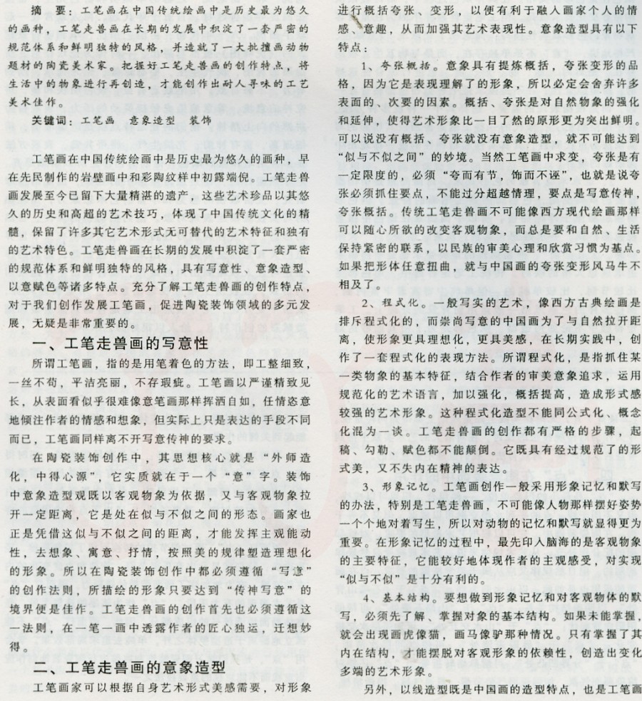 摘要:工笔画在中国传统绘画中是历史最为悠久的画种, 工笔走兽画在长期的发展中积淀了一套严密的规范体系和鲜明独特的风格,并造就了一大批擅画动物题材的陶瓷美术家。把握好工笔走兽画的创作特点,将生活中的物象进行再创造, 才能创作出耐人寻味的工艺美术佳作。 关键词:工笔画 意象造型 装饰 工笔画在中国传统绘画中是历史最为悠久的画种,早 在先民制作的岩壁画中和彩陶纹样中初露端倪。工笔走兽 画发展至今已留下大量精湛的遗产,这些艺术珍品以其悠 久的历史和高超的艺术技巧,体现了中国传统文化的精髓,保留了许多其它艺术形式无可替代的艺术特征和独有的艺术特色。工笔走兽画在长期的发展中积淀了一套严密的规范体系和鲜明独特的风格,具有写意性、意象造型、以意赋色等诸多特点。充分了解工笔走兽画的创作特点,对于我们创作发展工笔画,促进陶瓷装饰领域的多元发展,无疑是非常重要的。 一、工笔走兽画的写意性 所谓工笔画,指的是用笔着色的方法,即工整细致,一丝不苟,平洁亮丽,不存瑕疵。工笔画以严谨精致见长,从表面看似乎很难像意笔画那样挥洒自如,任情恣意地倾注作者的情感和想象,但实际上只是表达的手段不同而已,工笔画同样离不开写意传神的要求。 在陶瓷装饰创作中,其思想核心就是“外师造化,中得心源”,它实质就在于一个“意”字。装饰中意象造型观既以客观物象为依据,又与客观物象拉开一定距离,它是处在似与不似之间的形态。画家也正是凭借这似与不似之间的距离,才能发挥主观能动性,去想象、寓意、抒情,按照美的规律塑造理想化的形象。所以在陶瓷装饰创作中都必须遵循“写意”的创作法则,所描绘的形象只要达到“传神写意”的境界便是佳作。工笔走兽画的创作首先也必须遵循这一法则,在一笔一画中透露作者的匠心独运,迁想妙得。 二、工笔走兽画的意象造型 工笔画家可以根据自身艺术形式美感需要,对形象[本文未完,请阅读彩图] 彩图1