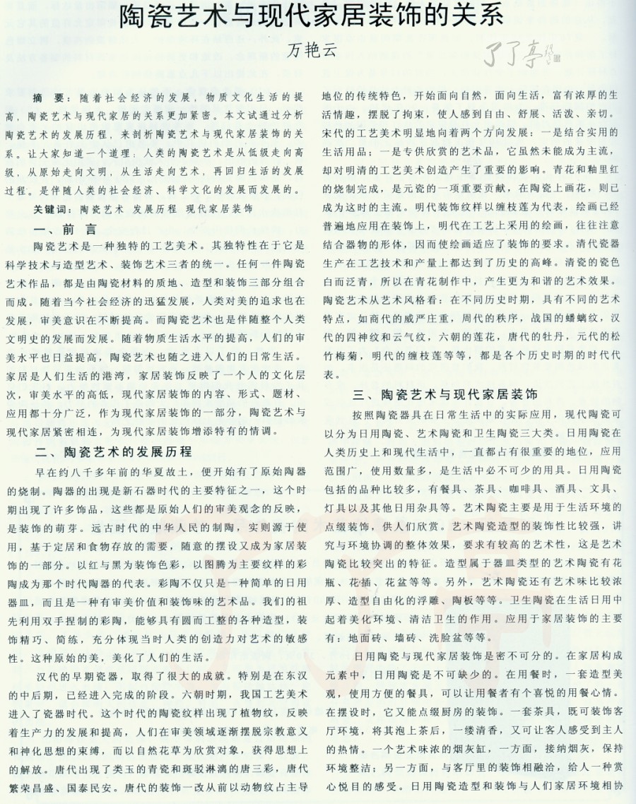 摘 要: 随着社会经济的发展, 物质文化生活的提高, 陶瓷艺术与现代家居的关系更加紧密。本文试通过分析陶瓷艺术的发展历程, 来剖析陶瓷艺术与现代家居装饰的关系。让大家知道一个道理: 人类的陶瓷艺术是从低级走向高级, 从原始走向文明, 从生活走向艺术, 再回归生活的发展过程·。是伴随人类的社会经济、科学文化的发展而发展的。 关键词: 陶瓷艺术发展历程 现代家居装饰 一、前言 陶瓷艺术是一种独特的工艺美术。其独特性在于它是科学技术与造型艺术、装饰艺术三者的统一。任何一件陶瓷艺术作品,都是由陶瓷材料的质地、造型和装饰三部分组合而成。随着当今社会经济的迅猛发展,人类对美的追求也在发展,审美意识在不断提高。而陶瓷艺术也是伴随整个人类文明史的发展而发展。随着物质生活水平的提高,人们的审美水平也日益提高,陶瓷艺术也随之进入人们的日常生活。家居是人们生活的港湾, 家居装饰反映了一个人的文化层次,审美水平的高低,现代家居装饰的内容、形式、题材、应用都十分广泛,作为现代家居装饰的一部分,陶瓷艺术与现代家居紧密相连,为现代家居装饰增添特有的情调。 二、陶瓷艺术的发展历程 早在约八千多年前的华夏故土,便开始有了原始陶器的烧制。陶器的出现是新石器时代的主要特征之一,这个时期出现了许多饰品,这些都是原始人们的审美观念的反映,是装饰的萌芽。远古时代的中华人民的制陶, 实则源于使用,基于定居和食物存放的需要,随意的摆设又成为家居装饰的一部分。以红与黑为装饰色彩, 以图腾为主要纹样的彩陶成为那个时代陶器的代表。彩陶不仅只是一种简单的日用器皿,而且是一种有审美价值和装饰味的艺术晶。我们的祖先利用双手捏制的彩陶,能够具有圆而工整的各种造型,装饰精巧、简练,充分体现当时人类的创造力对艺术的敏感性。这种原始的美,美化了人们的生活。 汉代的早期瓷器,取得了很大的成就。特别是在东汉的中后期, 已经进入完成的阶段。六朝时期,我国工艺美术进入了瓷器时代。这个时代的陶瓷纹样出现了植物纹,反映着生产力的发展和提高,人们在审美领域逐渐摆脱宗教意义和神化思想的束缚,而以自然花草为欣赏对象,获得思想上的解放。唐代出现了类玉的青瓷和斑驳淋漓的唐三彩,唐代繁荣昌盛、国泰民安。唐代的装饰一改从前以动物纹占主导地位的传统特色,开始面向自然,面向生活, 富有浓厚的生活情趣,摆脱了拘束,使人感到自由、舒展、活泼、亲切。宋代的工艺美术明显地向着两个方向发展:一是结合实用的生活用品;一是专供欣赏的艺术品,它虽然未能成为主流,却对明清的工艺美术创造产生了重要的影响。青花和釉里红的烧制完成,是元瓷的一项重要贡献,在陶瓷上画花,则己成为这时的主流。明代装饰纹样以缠枝莲为代表,绘画已经普遍地应用在装饰上,明代在工艺上采用的绘画,往往注意结合器物的形体,因而使绘画适应了装饰的要求。清代瓷器生产在工艺技术和产量上都达到了历史的高峰。清瓷的瓷色白而泛青,所以在青花制作中,产生更为和谐的艺术效果。陶瓷艺术从艺术风格看:在不同历史时期,具有不同的艺术特点,如商代的威严庄重,周代的秩序,战国的蟠螭纹,汉代的四神纹和云气纹,六朝的莲花,唐代的牡丹,元代的松竹梅菊, 明代的缠枝莲等等, 都是各个历史时期的时代代表。 三、陶瓷艺术与现代家居装饰 按照陶瓷器具在日常生活中的实际应用,现代陶瓷可以分为日用陶瓷、艺术陶瓷和卫生陶瓷三大类。 日用陶瓷在人类历史上和现代生活中,一直都占有很重要的地位,应用范围广,使用数量多,是生活中必不可少的用具。 日用陶瓷包括的品种比较多,有餐具、茶具、咖啡具、酒具、文具、灯具以及其他日用杂具等。艺术陶瓷主要是用于生活环境的点缀装饰,供人们欣赏。艺术陶瓷造型的装饰性比较强,讲究与环境协调的整体效果,要求有较高的艺术性,这是艺术陶瓷比较突出的特征。造型属于器皿类型的艺术陶瓷有花瓶、花插、花盆等等。另外, 艺术陶瓷还有艺术味比较浓厚、造型自由化的浮雕、陶板等等。卫生陶瓷在生活日用中起着美化环境、清洁卫生的作用。应用于家居装饰的主要有:地面砖、墙砖、洗脸盆等等。 日用陶瓷与现代家居装饰是密不可分的。在家居构成元素中, 日用陶瓷是不可缺少的。在用餐时,一套造型美观,使用方便的餐具,可以让用餐者有个喜悦的用餐心情。在摆设时,它又能点缀厨房的装饰。一套茶具,既可装饰客厅环境,将其泡上茶后,一缕清香,又可让客人感受到主人的热情。一个艺术味浓的烟灰缸,一方面,接纳烟灰,保持环境整洁;另一方面,与客厅里的装饰相融洽,给人一种赏心悦目的感受。 日用陶瓷造型和装饰与人们家居环境相协[本文未完,请阅读彩图]