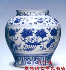 莲花,在景德镇陶瓷美术的青花、古彩、粉彩与新彩装饰中,是经常用到的题材之一。而且其画面和纹样,常常受到,广大收藏者所喜爱,拥有较大的市场。擅长于莲花纹饰的新人,更是层出不穷,一派“后浪推前浪”的大好景象! 一、 莲花的历史由来 莲花,又名荷花,亦称荷莲。莲花的历史较为久远。《诗经》中叫荷华,在《说文》中叫夫渠,在《楚辞》中叫夫容,在《群芳谱》中叫水芙蓉,《本草经》中叫水芝,《古今注》中叫泽芝,《三余贴》中叫玉环,《三余赘笔》中叫净友,《三柳轩杂识》中叫净客,《西溪丛语》中叫溪客,《类腋辑览》中叫它《六月春》等不一而足。 莲花的种类很多,据《花镜》和《群芳谱》记载,就有千叶莲、四面莲、并蒂莲、洒金莲和重台莲等十几种。莲花按用途分可以划为三类: 1,以食藕为主的叫藕莲,象美人红、大乌刺等.藕莲种植于水田中的叫田藕(亦称甜藕),种植于池塘中的叫塘藕(亦称糖藕).藕还能制成藕粉,是绿色高级营养食品。 2,以食莲为主的叫子莲.莲子食用又分莲肉与莲心,莲肉是甜汤中的美味佐料。莲心性味甘苦能明目,可以泡茶喝。如大白莲和九眼莲等。 3,以观赏为主的莲花,如并蒂莲、重台莲和睡莲等,花容十分艳美,且发出沁人肺腑的清香。 此外,莲花还是一种很有价值的中药.莲叶能清暑解热,莲蒂能和胃、安胎,莲梗能通气宽胸,莲瓣治暑热烦渴。莲须《雄蕊》能益肾固精,莲房能消瘀止血,莲子能健脾止泻,藕节能解酒毒,消烦恼。  二,莲花的文化现象 用莲花题材作纹饰,在战国的染器和绢帛的花纹上均可以找到它的踪迹。但是,莲花纹饰得于丰富和发展,还是从魏晋南北朝开始的,这与印度佛教传入中国有很大关系.晋代的鸡头壶中有莲花纹北魏石窟中的壁画,莫高窟中大小佛的石刻底座,均刻有莲花瓣纹,至隋唐、五代,“莲花纹已经传入寻常百姓家,”遍及屋柱的底座石墩上以及木质傢俬上,(如:花床、椅桌、箱柜上.)在年画中可以看到坐莲的如来和观音,剧中可以看到带着莲花帽的唐僧和法海.在皇宫的御花园与豪绅的后花园中均设置池圹种植着莲花.文人学士的衣袖上绣有莲花,在民间新婚的被子绣有并蒂莲.唐代诗人李白,还另有一个名字叫青莲.宋代名将杨廷昭(即杨六郎)被后人喻为莲花神,古人有“六郎似莲”之说。民间传说<东游记>.八仙飘海中何仙姑,是一位手执莲花的仙女.《群仙上寿》的和合二仙,和仙是一位手执莲花的仙童。明人写的古典小说《封神演义》中托塔天王的三太子哪吒是依托“莲花身”立命的天神。明代画家陈洪绶又名老莲,清代画家吴友如、马骀的百美图中有个美人步步生莲。 自六朝《即南北朝》以来,莲花深入人们生活的各个领域,形成一种文化现象,出现了许`多描写采莲的好诗好词。 六朝乐府清商曲中有一首好词:清荷盖绿水,芙蓉披红鲜,下有连根藕,上生并蒂莲.”在唐代日理万机的皇帝,唐太宗李世民曾乘彩舫下莲塘,写出了“船移分细浪,风散动浮香.游莺无定曲,惊鸾有乱行.莲稀船声断,水广棹歌长的”《采芙蓉》诗。王昌龄的“荷色罗裙一色裁,芙蓉向脸两边开.乱入池中看不见,闻歌始觉悟有人来”的《采莲曲》和白居易的“菱叶索波荷贴风,荷花深处小船通.逢郎欲语低头笑,碧玉搔头落水中”的《采莲曲》,是写江南采莲的千古绝唱,宋代范大成的《泛舟》”“行入闹荷无水面,红莲沉醉白莲酣”和杨万里的《晓出》“接天莲叶无穷碧,映日荷花别样红”。同是千古佳句。北宋周敦颐写过一篇《爱莲说》,借物咏志的抒情散文,写得情趣高雅,寓意深刻,耐人寻味。说“予独爱莲之出淤泥而不染,濯清涟而不妖,中通外直,不蔓不枝,香远益清,亭亭净植,可远观而不可亵焉”。文中还称菊花为隐士,牡丹为富贵者,莲花为君子,这三种形象的比拟,直到如今,还继续为人们所称道。莲花深入人们生活的各个领域。甚至充当人物中不同性别,不同年龄的角色,与人结下了不解之缘,而形成一种文化现象。 三、莲花的民间彩头 莲花与“连”、“廉”同音。所以,莲花可以寓意“连年”、“廉洁”象征着持续、久远、纯洁、清白。莲花又叫荷花,荷与“和”、“合”谐韵,因而,荷花可以寓意“和睦”、“合作”,象征着和合如意,同心同德,团结一致。因此,把莲花归为三类。 (一),以“连”字为彩头的题材 连年有余 连升三级 连年太平 连中三元 连年如意 连科登第 连年红利 百子连科 连生贵子 美誉连城 连生七子 仕途连年 连生九孙 好运连来