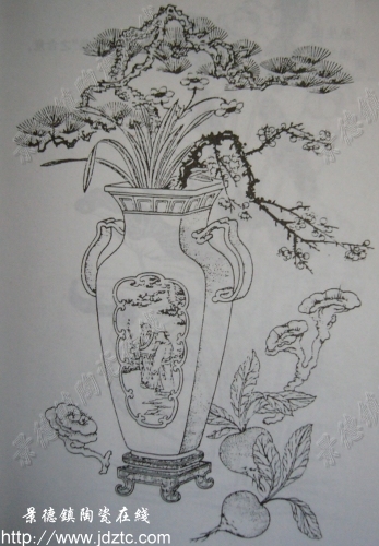 仙壶集庆 花瓶插以松、灵芝、梅、水仙、萝L图 仙壶乃指仙人居住的地方,松、梅、水仙等均为吉庆之意,因聚在一起即为集庆于仙壶。