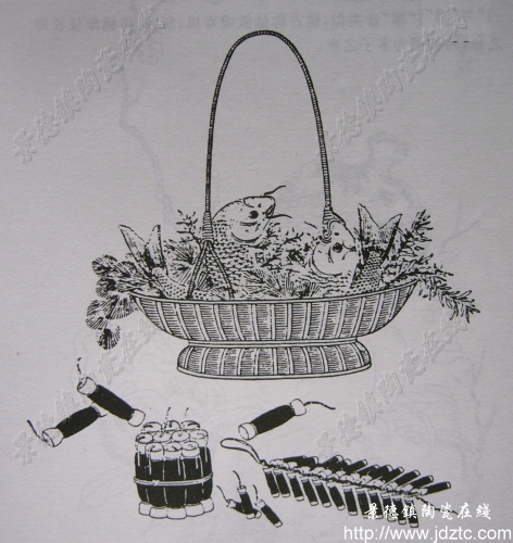年年有余爆竹数个与一篮鱼图爆竹含有年年之意,“鱼”与“余”同音、同声,为吉祥之意。