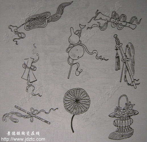 暗八仙见图50(1),是指八仙人各自持有的宝物:鱼鼓(张果老)、宝剑(吕洞宾)、花蓝(韩湘子)、笊篱或荷花(何仙姑)、葫芦(李铁拐)、扇子(汉钟离)、阴阳板(曹国舅)、横笛(蓝采和)八种。