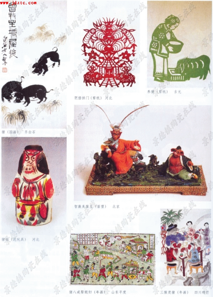 有的艺术作品也有意突出猪的弱点加以渲染,创作出幽默带有讽刺意味的作品,其中突出的是民间美术中对猪八戒形象的塑造。