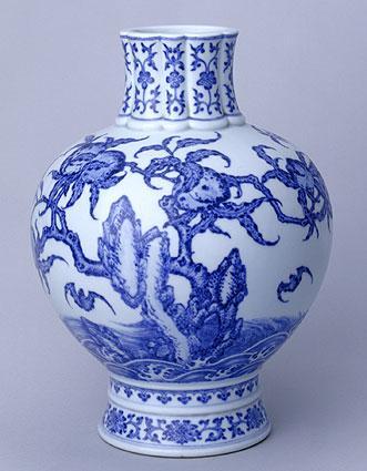 款识:乾隆青花多数是在器物底足内书写青花“大清乾隆年制”六字篆书款。极少见四字篆款和楷书款。高足盘、高足碗、双连、瓶一般是在足内写篆书六字横款。乾隆本朝官款字体紧凑工整、横平竖直,青花色调浓艳而又深沉。 记者 宋元东