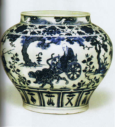 “鬼谷下山”的故事出自《战国策》。故事说的是战国时期,燕国和齐国交战,为齐国效命的孙膑为敌方所擒,他的师傅鬼谷子前往营救,率领众人一行下山。元代青花人物罐“鬼谷下山”描绘的便是鬼谷子下山的情景:鬼谷子坐在由狮虎共拉的两轮车上,后面跟着两个骑马的人,其中一个穿着武官衣服打了一面旗写有“鬼谷”两字。