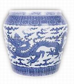 元代瓷器多属青花,龙纹更是常见的纹式,龙的形象以威猛见长。龙头保持了宋代翅鼻长嘴、张口瞪目的特点同时,颈部则更为细曲,龙身修长而显矫健之气,尾端作圆球火焰状,腿长有力,爪坚而利,一般多为三爪龙。其青花线条遒劲、自由奔放,浓淡有致、粗细得当。中国历史博物馆珍藏的一件元代《云龙》玉壶春瓶,瓶身绘一条追云蹈光的游龙,笔法自由,勾捺晕点,运用自如;龙纹须发腿毛飘动,云彩光势更加强了龙的动感,蓝白相映,别有一种率真洒脱的神韵,反映了元代瓷匠高深的艺术造诣和娴熟的工艺技巧。