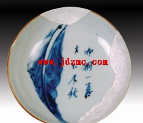 这些画着叶片、题有诗句的瓷片,从生产的时间来看,可以断为崇祯到康熙年间。即从明末战乱时期到清初天下大定之日。从诗句内容来看也很切合这段时期社会背景。如明末,崇祯初登皇权宝座,整顿朝纲,一扫阉党乌烟瘴气。魏忠贤畏罪自杀,朝政为之一振,朝野上下人心大快。反映到瓷绘题词上,则是轻松明丽的语调。如:“风弄梅花影”、“落日过船好,轻风生浪迟”。