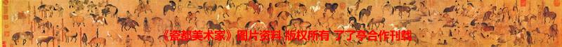 《百马图》 唐佚名绢本设色 纵26.7厘米横302.1 厘米 北京故宫博物院藏 此图卷共描绘各种马95 匹,牧马的奚官与圉人41 人在一条河中及岸边洗马、戏马、驯马、饲马的场面。这幅图中所描绘的近百匹黑、白、红、花等各色马,有动有静,姿态各异,生动活泼。画家对马的描绘,极善抓住其动态和神情,运动中的马被表现得活泼顽皮,静立时的马又被表现得庄重威武。画中笔法清秀温雅,敷色清淡,可以看出唐法向宋元法变化的痕迹。