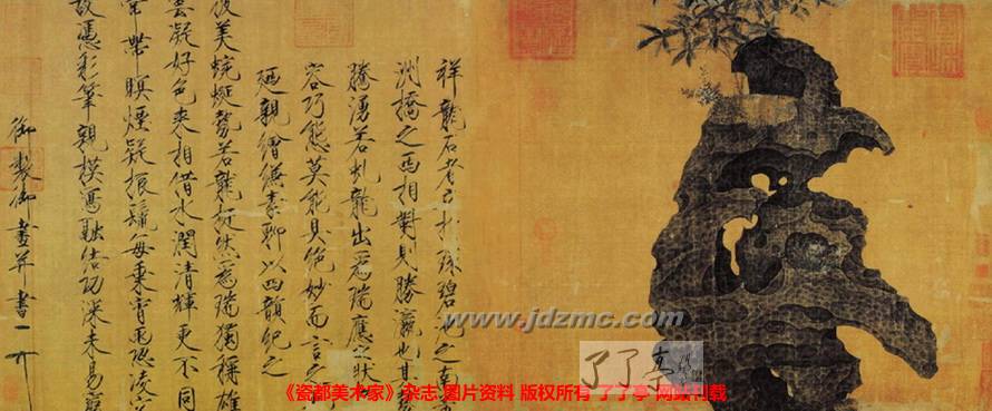 赵佶绘画重写生,以精工逼真著称。此卷分左右两部分,右部画宫苑中一珍奇石头“祥龙石”,左部为赵佶以“瘦金书”所写的题记、题诗。徽宗皇帝以细劲线条勾勒出玲珑剔透的奇石轮廓和纹理,并施水墨层层渍染,表现出石的坚硬和湿润的质感,显得一丝不苟。而作为皇帝的画家之所以对描绘“祥龙石”如此感兴趣,则如题诗所说,是因为“彼美蜿蜒势若龙,挺然为瑞独称雄”。作品具有“瑞应”的象征寓意。