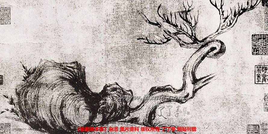 又题《木石图》。定此画为苏轼作品,主要根据画后与他同时代的米芾、刘良佐的题诗。画面左侧以快速有力的旋转笔法刻画一块怪石,画面右侧以干枯笔法刻画一株枯树,甚至那树干扭曲还转了一个弯,姿态虬屈,给观者强烈的视觉冲击。正如米芾《画史》所说:“子瞻作枯木,枝干虬屈无端。石皴硬,亦怪怪奇奇无端,如其胸中盘郁也。”苏轼(1037-1101),字子瞻,号东坡居士,眉山(今属四川)人。嘉佑进士,因反对王安石及其新法,贬谪黄州。