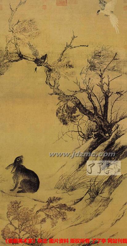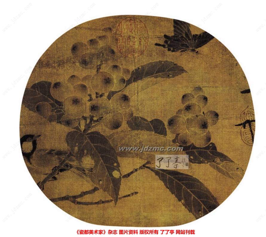 赵佶于靖康二年(1127)被金兵俘虏,后死于五国城(今黑龙江依兰)。在位时广收历代文物、书画,扩充并亲自掌管翰林图画院。其画重视写生,以精工逼真著称;亦擅书法,自称“瘦金书”。此图绘一山鸟立于枇杷树上,描绘精微细致,构图虽然简洁,笔法却极为简括而具表现力,是宋徽宗花鸟画中的精品。