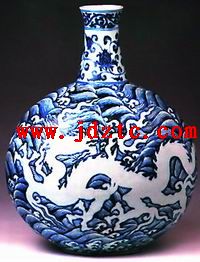 青花海水白龙纹扁瓶,明宣德官窑传世品。通高47.4厘米、口径8.1厘米、底径15.7厘米。直口、束颈、溜肩、圆扁腹。颈部饰青花缠枝牡丹花纹,以单勾平涂技法绘成,颈下肩部书横向大明宣德年制楷书款。器腹满饰勾边露白青花海水波涛,使蓝白相间的波涛翻腾汹涌、层次分明。青花发色浓艳深蓝,亦有小颗粒黑褐色晶斑散布于图案之间。主题纹为一条穿波戏浪回首观望的白龙,白龙轻舒利爪,回首开口,舞动劲键的躯体,搏浪前行,神态威猛,极富动感。