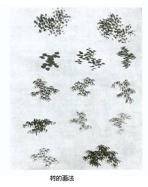 中国山水画中树叶的画法,可以分为点叶法和勾叶法,另外也有少量点勾相结合的画法,如介字间双勾点,椿树点间双勾。 点叶法有圆点类,如胡椒点、柏叶点等;平点类,如大混点、小混点、平头点等;下垂点类,如个字点、介字点、竹叶点、梧桐点等;上仰点类,如鼠足点、松叶点、仰头点等:其他如梅花点、椿树点等。 夹叶法也有几种类型:圆形、三角形、菊花形、介字形、个字形、半菊花形等。