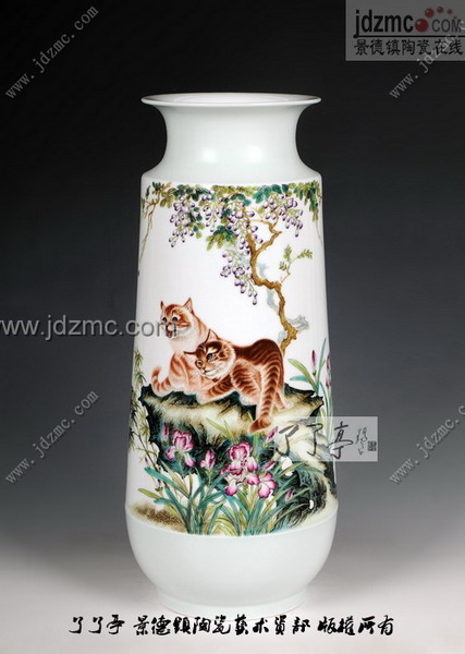 粉彩走兽画是在继承和延伸传统中国陶瓷走兽画艺术精髓的前提下,进一步加强色彩和配景的烘托,构建更加多彩多姿的画面,烘托出更为形象的走兽情态。因此,粉彩走兽画的配景要更加注重画兽的工笔和创作的意境,要有新的视觉切入点,从多角度和更宽阔的视野范围,把走兽放归色彩斑斓而奇妙的大自然,使其在广茂的自然界中畅游、休闲、运动..