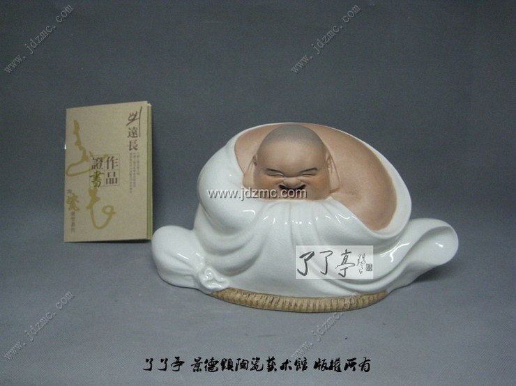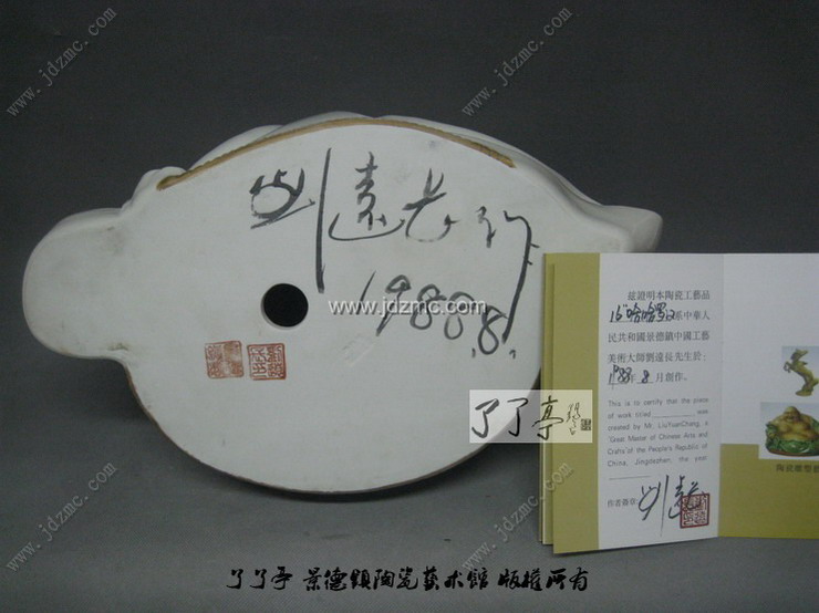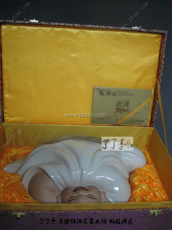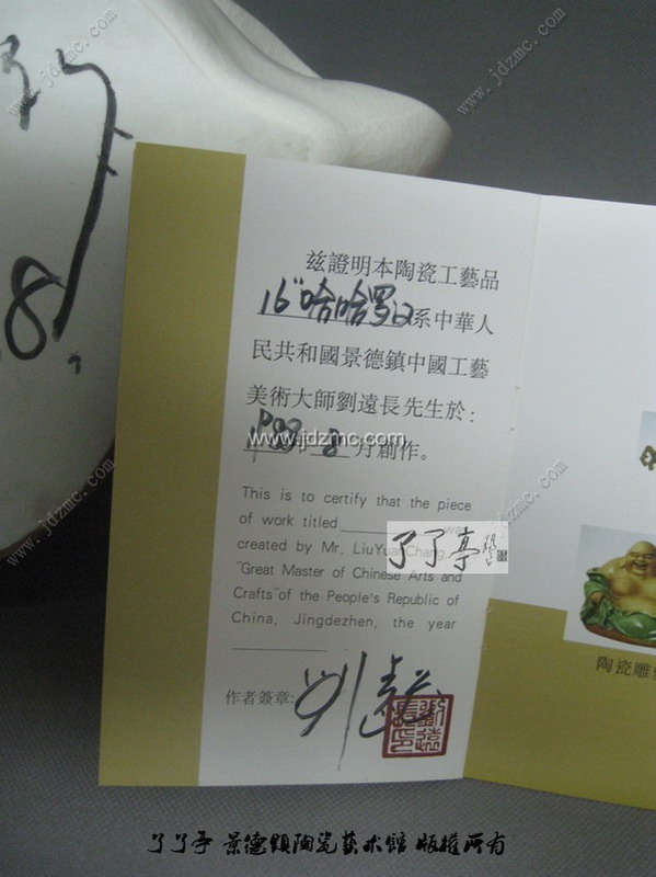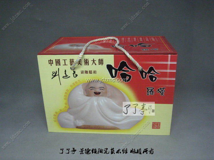 刘远长的哈哈罗汉是市面上仿制品最多的一种雕塑,应有些朋友的要求,笔者将刘远长哈哈罗汉的12寸和16寸的全部照片登载出来。其中包括,包装盒,作品全景、签字、证书四个方面,因为刘远长大师的包装和证书随时可能更改,因而这篇文章的实用性将保持到下一次文章更新。简单介绍一下,1988.8是创作日期不是制作日期,该类作品没有编号,没有限量,价格不高,历年来的哈哈罗汉只有白纹片,其他都未有产出,而市场上常见的还有青花、青花加彩,颜色釉、釉上彩等多种。如果有其他疑问,可以搜索关键词“哈哈罗汉”在了了亭网站的文章中心,里面有完整的各种关于哈哈罗汉的介绍。了了亭·李申盛/文