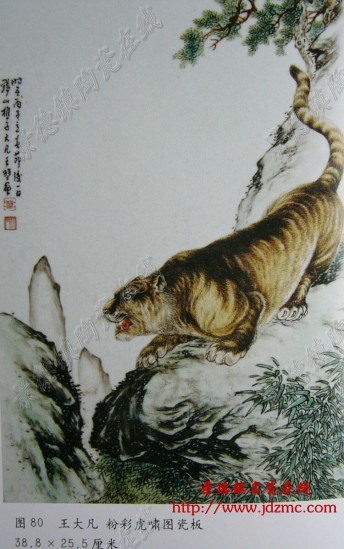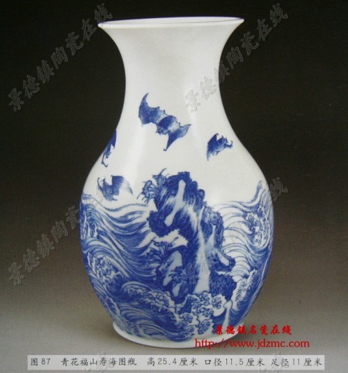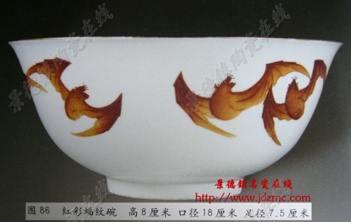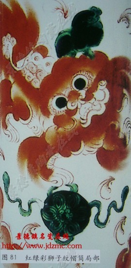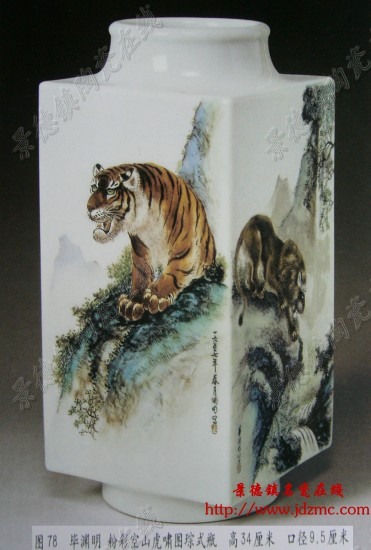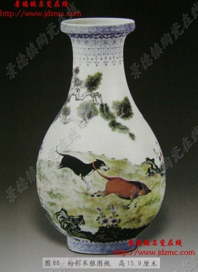 值得一提的是民国时期的一些非擅画动物的名家亦偶作动物画,如擅长人物画的王琦、王大凡曾绘虎,如以花鸟名世的刘雨岑、余翰青有鱼藻、鹿传世。虽然所作非其专长,不能同以此为业的名家相提并论,但因艺术修养深厚,如京剧名家客串一样,其功力亦非寻常艺人可比。 图79为王琦粉彩虎啸图瓷板,画面上部为大面积空白,下为腾起的海涛,中间巨石之上一只猛虎仰天长啸,旁为一轮光芒四射的红日,猛虎形态逼真,可见作者造型能力之强。上题有“拟唐寅之笔法,西昌匋迷散人写意”及红彩方章两枚。 图80为王大凡1936年粉彩虎啸图瓷板,画面构图为斜三角形,左为大面积留白,一只下山猛虎,造型准确,形神兼备,气势凶猛,皮毛见有皴擦之笔,毛感自然。平心而论,此作虽不及毕渊明成名之后的虎,但较上图略胜一筹,左边墨书“时在丙子年立春节后一日,黟山樵子大凡王壁画”及红彩朱文“ ”、“大凡”方章二枚。 民国时的狮纹多装饰在档次稍低的日用器皿上。 图81为民国时期最为常见的红绿彩狮子纹帽筒局部,一头红狮体态健壮,头下尾上,眼大如铃,尾毛旋转如轮,极为活泼可爱。上有一绿彩小狮,下为蓝彩戏球小狮。造型夸张,虽画工不精,但民间狮子舞的韵味浓郁,另侧有墨书“时属丙辰仲夏”字样,为1916年作品。晚清时多见此纹饰器物,如图82为清光绪矾红彩太狮少狮图瓷板局部,大狮子怀抱绣球神态认真,小狮子昂首高望。狮子毛发细密,浓淡过渡自然。绘画较前者细腻,但活泼可爱的韵味不足。由此可知,民国时的写意之作多追求民间浓郁的生活气息。 图83为民国珊瑚红釉太狮少狮图瓶,此纹饰为清代传统纹饰之一,以狮谐师。太师古代官名,为三公之位最尊者,周代始置,辅弼天子治理天下。少师古代官名,为三孤之一,周代始置,亦为辅弼天子之官,地位次于太师。此器纹饰有康熙官窑之风,线条流畅,绘画精细,体格健壮,填彩之后用墨点饰。鬣毛如卷云,尾毛似绣球,惟凶猛威武的神态不及康熙。但较晚清同类题材的民间色彩及装饰味仍有很大区别。底青花双圈“大清康熙年制”楷款。 鹿纹在民国时较为常见,擅长此技者有方云峰、余翰青及莫秋霞等人。 图84为方云峰1931年粉彩鹿寿松贞图瓷板,画面左疏右密,右边虬劲的古松枝干盘曲,使画面极富韵律。松针以线勾描,笔法工整,但不呆板,上罩青绿,于色彩深浅变化中表现出茂盛之意。居中的梅花鹿造型准确,与图75一样,于传统笔墨中加入西洋素描技法,皮毛质感强烈真实,为前人所不及。左上方墨书“鹿寿松贞。辛未仲春方佩霞写于珠山”及红彩白文“方”圆章一枚。 图85为余翰青1941年粉彩双鹿图印泥盒,在直径6.5厘米的印盒面上,作者绘有一卧一立双鹿,虽笔法不及方云峰之作细腻真实,有传统鹿纹的影子,但皮毛及梅花斑点亦非晚清笨拙体态白彩点饰之作可比。左边墨书“辛巳春月抚元人法于珠山”丛红彩印章两方。印盒底外壁墨书“伯作宝篇,子厂孙孙永”篆籀文及行书“翰青书”,另有红彩白文“画印”一枚,底红彩方框“翰青”楷款。 蝠纹为清代传统吉祥寓意纹饰之一,或福山寿海,五蝠捧寿,或云蝠,洪福齐大。民国瓷器上的蝠纹多仿清代风格,构图无变化,但画法略有新意。 图86红彩蝠纹碗,构图疏朗,蝠纹姿态舒展大方。翼展较宽,筋脉清晰可见,正面色彩渲染有深浅变化,背面填色上加点饰,绘画细腻。底虽书“大清乾隆年制”篆款,但非仿乾隆之作,因乾隆蝠纹多少有些图案化倾向,而与晚清装饰韵味浓郁的蝠纹更截然不同,艺术成就较高。 图87青花福山寿海图瓶,纹饰构图为清康熙时多见,苍茫云天,海浪起伏,一仙山由海浪中突兀而起,十只青花蝙蝠在穿梭飞舞。仙山皴法细腻,海水线条流畅。蝠纹高度写实,头如鼠,须如芒,翼上有浓淡变化,姿态生动传神,青花色泽淡雅而富有层次,与晚清蝠纹双翼细长,或弯如弓的平涂画法明显不同。 以狼和猪为瓷器纹饰历代少见,狼因其性残而为艺人所不为,《广雅·释诂》:“狼,戾,很也。”猪则因体肥态憨不见于瓷器装饰,而二者组合在一起的狼奔猪遁图则更为新奇。 图88为粉彩豕狼图瓶,口沿处饰——周蓝料回纹,下为璎珞纹饰,足外墙亦饰一周回纹。画面构图饱满,一只恶狼在原野上追逐一只肥猪,体态一瘦一肥,色泽一黑一褐,下为皴擦而成的洞石,上为勾线渲染的松树,背景开阔。狼猪有西洋笔法,衬景则为中国传统画韵。背面墨书“豕性钝为首,狼形恶为贪”及“乾隆御览之宝”、“仁化”、“世宁”、“碧露”红彩印章四枚。底“乾隆御制”楷款。 海兽为明代艺人杜撰之兽,明清两代瓷器上多见此兽。民国海兽纹饰多承袭清康熙民窑风格。图89为青花海兽纹凤尾尊,外壁分上下两组海兽纹饰,中以细密的几何条纹相隔,海兽凶猛威武,肌肉隆起处有细密均匀的鳞甲。与康熙民窑作品相比较,绘画不甚工细,特别是尾毛以细密的线条代替渲染。头部生动气韵不足,略显呆滞。青花色泽泛紫,层次感稍差。即便如此,仍不失为较成功的仿前朝之作。 民国时见有绘十二生肖纹饰器物。十二生肖又称十二相属,是古代以十二种动物配十二支,后以人生在某年即肖某物,如子年生的肖鼠,丑年生的肖牛等。其起源于何时不甚可考,清赵翼《陔余丛考·十二相属起于后汉》:“窃意此本起于北俗,至汉时呼韩邪钦塞人居五原,与齐民相杂,遂流传人中国耳……则十二相属起于后汉无疑