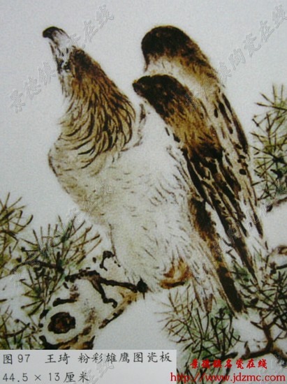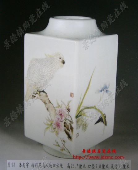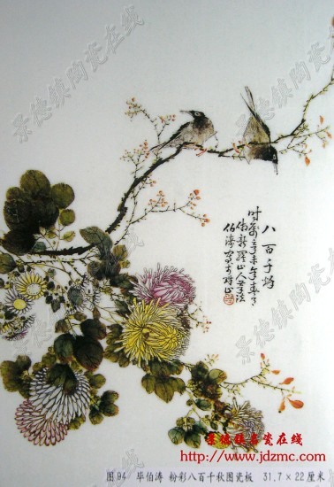 花鸟草虫是我国瓷器传统装饰纹样中的一大门类,历史悠久,是历代瓷器装饰中使用最广泛、最为普遍的题材。民国时期花鸟草虫纹饰在所有纹饰中占有重要的位置,大凡前朝所见有的纹饰,在民国瓷器上均有反映,如百鸟之王的凤凰,号称文禽的孔雀,象征美好爱情的鸳鸯,有仙禽之谓的鹤,传递佳音的喜鹊,具有五德的雉鸡,寓意吉祥的鹌鹑及白头翁,威武凶猛的鹰,善学人语的八哥及鹦鹉,翩翩起舞的蝴蝶,还有一些不知名的花鸟飞禽及蜻蜓、蟋蟀等草虫,它们构成了民国瓷器上绚丽多彩的画面。 民国时期从事瓷器花鸟纹饰创作的艺人之多,超过山水与人物画的从业人员,以“珠山八友”为例,专事花鸟草虫创作的就有程意亭、刘雨岑、毕伯涛等,此为彩瓷大师级人物,而余者除个别人外,亦见有花鸟题材作品传世。这构成了民国时期瓷器花鸟纹饰的一大特点。其次,名家辈出、高手林立,以其不凡的艺术创作在民国瓷器装饰上占有一席之地。其三,在继承传统的同时,多有所创新,真正达到了以瓷代纸的艺术效果。其四,整体创作水平较高,除低档生活用瓷外,绝少粗制滥造之作。 民国时期从事花鸟瓷绘艺术水平较高的艺人,在景德镇以“珠山八友”中人为领军人物,在南昌则以邹文侯为代表。他们或成名于20世纪30年代,在民国时创作颇丰;或成名稍晚,但出手不凡,民国时亦有佳作;或英年早逝,如流星闪烁,末能尽展才艺;有的则生平不详,或在作画时隐姓埋名,为后人留下了深深的遗憾。他们当中较为杰出的有方云峰、余翰青、李明亮、刘仲卿、章士保、程芸农、余鹤筠、王英豪、熊梦亭、陆云山、石宇初、万少岩等人。为使读者了解他们的作品风格,分别加以介绍,而在介绍他们的作品之前,不能不提及潘匋宇。 潘匋宇作为民国粉彩瓷绘的奠基人之一,不仅投身教育,培养人才,如珠山八友中的花鸟艺人程意亭、刘雨岑均出其门下,而且擅绘粉彩,其花鸟草虫颇精,笔法极为秀丽,颇有清恽寿平水墨淡彩、清润明丽之风,又有华秋岳构图新颖、形象生动多姿之韵味。民国《鄱阳县志·人物志》载:所出作品,曾参加美国芝加哥、费城博览会,均能为祖国载得荣誉以归。 图93为潘甸宇粉彩花鸟人物四方瓶,四面分别绘碧桃鹦鹉,兰草鸣蝉、牵牛蜜蜂及山水人物,全面展示了作者工山水人物,擅花鸟草虫的技艺。构图疏朗大方,画面多为斜角式,笔法细致。以碧桃鹦鹉为例,碧桃老干渲染而成,疤节处以墨彩层层渲染,立体感颇强。旁边绘盛开的花朵,色彩淡雅。白鹦鹉栖于树上,羽毛以细劲的线条双勾而成,内填粉白,头羽及尾部略加水绿,口、眼及爪以墨彩渲染,有明显的浓淡变化。右边一方红彩白朱“鼎钧”方章。整个画面干净利落,有宋代花鸟画写实之韵味。以鹦鹉装饰瓷器,明清时较为少见。但从晚清的瓷器花鸟画来看,虽艺术成就不低,但鲜有此清新淡雅之风格。 珠山八友之一的毕伯涛,以传统的双勾、没骨法绘粉彩花鸟,用笔工细,设色艳丽,具有浓郁的传统文人画韵味。 图94为毕伯涛1931年粉彩八百千秋图瓷板,构图上疏下密,老干新枝穿插,使画面呈“<”形,枝干以赭墨没骨法绘画,运笔顿挫有力,极显虬劲之势,用红彩点饰枝头红叶,透出秋的气息。菊花以双勾渲染为之,花姿或正或侧,或俯或仰;花形或怒放,或含苞,花朵或红或蓝,或黄或紫,可谓样样俱全,在绿叶的衬托下更显千娇百媚。线条流畅自然,色彩丰富,层次自然清晰。枝头两个八哥在婉转鸣唱,黑头褐腹红爪,生动可爱。中右处墨书“八百千秋,时属辛未年春月仿新罗山人笔法,伯涛写于珠山”及红彩白文“印”圆章一枚。新罗山人为清画家华曲之号,观毕氏此作确有新罗枯笔干墨淡彩,敷色鲜嫩不腻,画风清秀明丽的特点。毕氏另有写意风格的花鸟图传世,但不及工笔成就高,淋漓恣肆的韵味不足。 珠山八友之一的程意亭,以用笔细腻精工、重彩研丽,鲜灵生动名动一时。其传世品极为丰富。 图95为程意亭粉彩孔雀开屏图瓷板,画面开阔,一只孔雀独立于青绿洞石之上。其用笔极尽工细严谨之能事,孔雀的头、背、腹、羽画法各不相同,或勾或染,或点或皴,将其羽毛刻划得细致人微,其色彩艳丽斑斓,翠绿的背羽,金黄的腹羽,如墨的翅羽,层次极为丰富,而行将开屏的尾羽更是红绿相间,绿中闪金,翎眼黄中点墨,令人眩目。洞石旁的花卉亦绘画精湛,花鸟相对,动静呼应。落“意亭画”及红彩白文“程印”方章一枚,为程氏精品。以孔雀为瓷器装饰在元代较为普及,明清时较为流行,但无论是官窑还是民窑均未见此精湛之作。尤其是晚清孔雀更是色彩艳俗,绘工粗糙。程氏另见有柔和淡雅风格的花鸟图,用笔之工细不逊前者。 刘雨岑虽在珠山八友之中年龄最小,但因系潘匋宇之弟子,得名师指点,故二十几岁即入名家之列。但严格来讲,早期作品并不十分出色,个人风格亦不明显。中期作品始见个人风格,尤其是在前人立粉洗染法基础上创“水点桃花”技法后,不仅在粉彩艺术上产生极大影响,而且终成一代名家。 图96为刘雨岑1929年粉彩八哥图瓷板,构图上密下疏。桃红柳绿,柳树以墨勾线,上罩浓淡青绿,春风吹拂之下极为洒脱;桃花以点虱法绘画,娇艳妩媚。桃枝柳荫之中,有两只墨彩八哥,一只高声鸣唱,一回首啄羽,黄嘴红爪,颇为传神。左上墨书“桃与柳,依旧斗芬芳,千丝万片搅柔肠,怕听鸟如簧。调寄谢秋娘。己巳夏莫,刘雨城并题于饮冰斋”