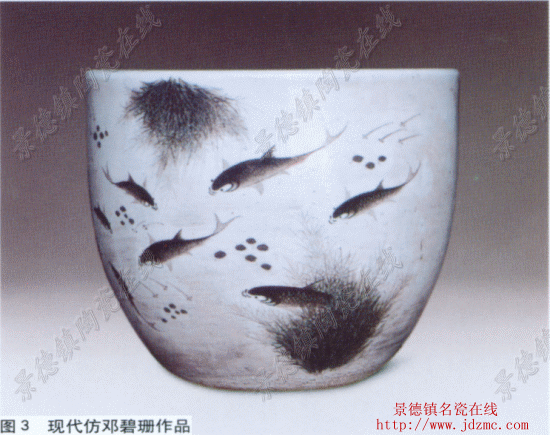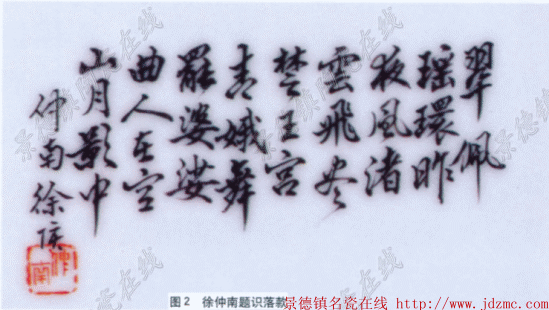 二是徐氏撇叶时胸有成竹,意在笔先,凝缩处不局促,力全而不苦涩。模仿者往住形在笔先,看一笔画一步,故而笔道呆滞,料不均匀,筋脉中缺少力量。 三是徐氏画竹干、竹枝,笔道墨韵利落有力,苍劲挺拔,气脉连贯,节节有韵,表现出秀竹劲节凌云之气。而模仿者笔道脱略,局促无神,料色涩滞。如以模仿品(图1)与书中徐氏作品真迹对比(参见书中47页作品),以上三点一看便知。 另外,细察徐氏画竹时所配的青石,也能看出作品的真赝。徐氏画石以配竹,多是在画面的左右下角以三七之法起笔,有的一石独居,有的两石相依,用笔波折顿挫,似折带皴,勾画有法,灵透生动,轮廓转折之处虽不见圭角,但有雄浑之气。石块肌理以尖笔斜点皴拓,似雨点皴法,疏密有致,转折处点大色深,笔法中透出轻松的弹力,偶尔在石头边沿或相叠处以皴点苔,清新秀丽。而模仿品轮廓勾描生硬,点皴的布局平均刻板,笔法貌似神离,程式化、概念化太重,稍作比较一目了然。 把握徐氏填色之特点,也是区别作品真赝的关键。徐氏以墨色撇画竹叶后,并不在每片叶子上填彩,而是着眼一丛一组,注重整体,以取象传韵的手法傅彩。而模仿者没有胸中之竹,按叶填彩,呆板僵硬,往往画虎不成反类犬。另外,徐氏以墨色画青石后,填色多用翠青,青石的尖部色浓笔重,青石的根部色淡笔轻,苍润浑厚,极富质感。 徐仲南晚年专攻竹石以后,形成了不尚华丽、追求平淡古雅的创作风貌,粉彩着色光亮淡雅,层次清晰。清冷的色调,概括的笔法,配以诗书印章,具有浓郁的中国文人画的意味。 题识印款 徐仲南的书法洒脱秀逸,苍润俊朗,作品题款或行书或行楷,但以行书为多,与同时期其他名家不同的是少见长篇题款,一般都是题写一两句诗文后再落干支姓名款。 常见落款为:“仲南徐陔写”、“徐南写”、“竹里老人徐仲南”、“南州竹里老人徐仲南写于珠山栖碧山馆之西窗”等(图2)。 常见印款为:“仲南”“徐陔之印”、“徐印”。 邓碧珊瓷画鉴定 邓碧珊生于1874年,卒于1930年,享年56岁。其成名较早,为景德镇瓷上肖像画创始人,他不仅开瓷板肖像画之先,而且最早使用九宫格放大绘制肖像。20世纪20—30年代以画鱼藻为主,并大胆借鉴吸收东洋画技法,形成独特风格,在景德镇享有“鱼王”美称。“珠山八友”中他去世最早,留下作品不多。 笔墨(料)特征 邓碧珊早期以炭精擦笔画法绘瓷像,留下作品不多。近些年也有少量仿邓碧珊早期瓷像画的赝品出现,从笔墨技巧来看,邓氏之瓷像画借鉴了东洋画精于描摹的技法,层次细腻,笔画精微,有较高的工艺技巧。而模仿品多是黑白层次差别较大,人相五官刻意画得“深入”,反而使形貌神态呆滞,常出现死板僵化之弊。由于瓷像画工艺性很强,笔墨特征相对缺乏个性化,因此在鉴定邓氏早期瓷画像作品时,要多从胎釉方面去分析,因为邓氏画瓷像是在民国初期,当时的胎釉特征是造假者难以模仿的。 邓碧珊在20世纪初,以瓷上肖像画的技法,画过一批墨彩风景瓷板画,如《福建金山塔》、《四川三苏故宅》等。此类作品存世虽少,但也鱼龙混杂。邓氏墨彩风景瓷板画的笔墨特点是:屋舍以艳黑单色描绘,细致部分用笃笔笃匀,可细腻地画出复杂的形象和细节丰富的浓淡层次,严谨精致。而模仿品擦拓的层次单薄,在表现物体的形象和细节丰富的浓淡层次方面多有欠缺。另外邓氏作此类风景画时,屋顶瓦楞以扒笔扒出,手法严谨精致,笔路稳健,深浅适度,而模仿品笔路飘浮,轻重不齐。 仿邓氏之赝品,大多是他的“鱼藻图”。邓氏20世纪20—30年代以画鱼藻为主,他的鱼藻画将中国画笔墨意趣与日本绘画技法相结合获得成功之后,又融入肖像画的细腻风格,堪称匠心独运。从笔墨特征来看,邓氏的鱼藻瓷画,主要有以下几个特点: 一是邓氏画水藻以艳黑勾描,色料有深有浅,有浓有淡,一丛一丛相互交叠,层次丰富又不杂乱,而模仿品的勾描平均,少复笔,水藻穿插概念刻板,勾描之笔韵不具邓氏个性,尤其是起落笔法与邓氏之差别一看便知。 二 是邓氏画水藻好用水绿在施有玻璃白的粉底上进行浓淡积染,讲究深浅变化,而模仿品水藻染色时玻璃白打底淡薄,故染色层次少,颜色单薄,没有重叠层次,少厚重感。 三 是邓氏画水藻染色时注重冷暖变化,水藻的中心部位和密集处染色以大绿之类的冷色调为主,从水藻中心部位到边缘处,渐次由大绿过渡到草绿或赭绿的暖色调,而模仿品往往在色调方面,难以做到如此微妙之变化。 四 是邓氏的“鱼藻图”上总是两三尾游鱼,鱼背色调黑重,渐次向鱼腹处淡去,层次微妙。然后在料色未干之时,以点画之笔穿插画鱼鳞,细腻之致,夺造化之工,得其形也得其趣。曾有人问其画鱼秘诀,他一言以蔽之:“游而不散。”而模仿品所画之鱼少精微层次,并用扒笔剐画鱼鳞,以后人画鱼之法硬套在仿邓氏的作品上,张冠李戴。 五 是邓氏的鱼藻图上总是数点浮萍,不事波涛,也无潋影,厚不因多,薄不因少,笔精墨妙。而模仿品不甚经意,少而无韵,疏而无神。如以模仿品(图3)与书中邓氏作品真迹对比(参见书中97页一117页作品),以上几点一目了然。 题识印款 邓氏工书法,以篆隶为佳,行书规整遒劲,章草涵韵很足。王琦也曾执弟子礼向其学习书法。作品题款以隶书、行书为多,格式规范,书体个性突出。 常见落款为:“铁肩子邓碧珊画于珠山客邸”、“铁肩子邓碧珊画意”、“邓碧珊画于珠山”