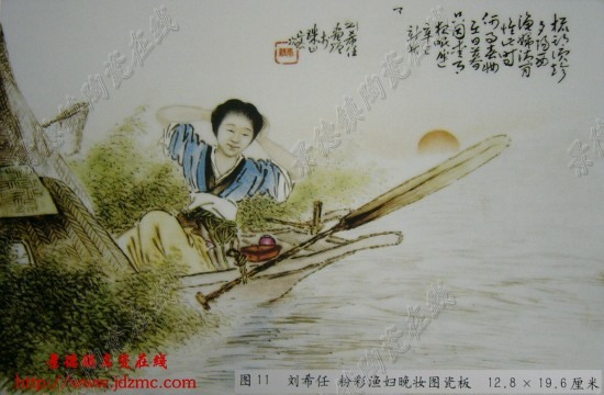 图11为刘希任1941年渔妇晚妆图瓷板,构图右疏左密,渔家少妇半卧船头,开相极为俊美,面部略加渲染,衣纹线条虽有顿挫,但柔美流畅,水草以赭墨或勾或点,上罩青绿。长桨斜在船头,将画面一分为二,江水淡彩渲染,红日西沉,一派秀美的水乡风光。上落“辛巳新秋,刘希任画于珠山客次”及红彩朱文“希任”方章一枚。由此作可知,刘希任虽受王琦影响较大,但人物画仍有独家风格之说不虚。