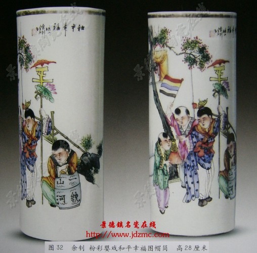 图32为粉彩婴戏和平幸福图帽筒,构图饱满,一株红杏树下四个身着不同衣裤、发型各异的童子在游戏,半蹲的童子双臂支着上写“一统山河”的瓷墩;中间高个童子手持竹杖,杖端变化为“平”字,上有红蝠,下有盛开的绿叶红荷。左侧童子手执五色旗,最外边的童子则手捧瓷瓶。勾线流畅,色彩艳丽,面部略染腮红。荷、瓶、杏、蝠谐音为“和平幸福”,上方墨书“和平幸福,珠山余钊珍品”,底红彩“洪宪年制”楷款。