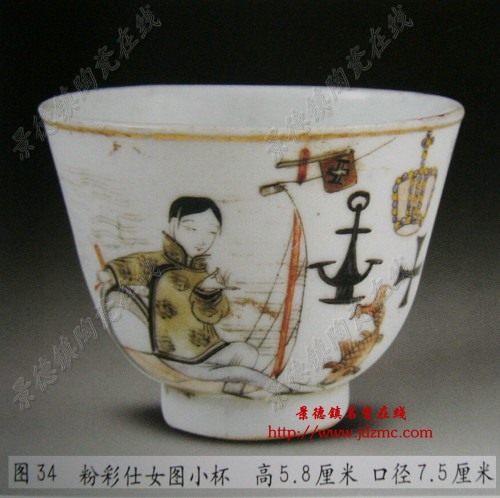 图34为粉彩仕女图小杯,外壁一侧绘一着高领团花小袄的女子斜坐在小舢板上,船帆鼓起,上画铁锚,下饰游鱼,桅杆上挂一小旗。上书“亚”字。画面构图及人物画法均无可取之处,但另面墨书“亚细亚油,光亮无匹,价廉物美,寰球第一”字样,别有新意,亦为广告宣传之物,与图30有异曲同工之妙,底红彩白文“映建轩造”楷款。