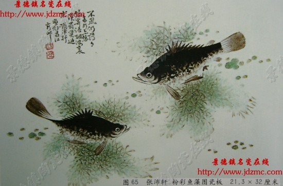 图65为张沛轩粉彩鱼藻图瓷板,构图与乃师常见的上下法不同,采用左右构图法,两尾鳜鱼在浮萍水草间戏耍,左边一尾体态轻盈,右边一尾神态沉着。鱼鳞以浓淡不同的墨点虱成,虽明暗层次不甚清晰,但随意之中见质感。赭墨勾勒之外以浅绿渲染,虽无涟漪,但水草游鱼尽得碧池之韵味。左上方墨书“不风仍荡荡,无水亦悠悠。寄语烟波里,渔翁莫过求。张沛轩画于昌江客邸”及红彩白文“画”、“印”方章二枚。