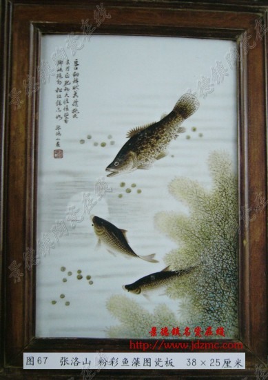 图67为张洛山粉彩鱼藻图瓷板,构图有邓碧珊之风,绘有一尾鳜鱼两尾鲢鱼。鳜鱼由上向下游来,一鲢鱼尾鳍摇摆向上游去,似乎在追逐水中的月影。另一尾鲢鱼匿在水草中。右下角为大片面的水草,水面上有浮萍点点。此作鳜鱼墨笔鲺鳞,鲢鱼晕色丰富,锦鳞片片。与邓氏不同的是水面以淡彩染水波涟漪。左上方墨书“巨口细鳞状如龙,桃花三月正肥初。天涯怀得家乡味,除却松江总不如。张洛山画”及红彩朱文“洛山”方章一枚。“除却松江总不如”句巧借晋人张翰在洛阳作官,见秋风起,想念家乡苏州味美的鲈鱼,便弃官回乡的典故,读来虽有画外之音,但颇有品味之处。