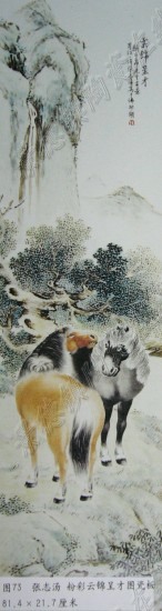 图73为张志汤粉彩云锦呈才图瓷板,构图一如其传统风格,极为严谨,上为淡墨皴点复罩青绿的山峦。勾点皴染的密林前是两匹膘肥体壮的骏马,一正一背,一红一黑,造型准确,形象生动,设色自然真实,尤其鬃毛及肌肉的皴擦极富质感。为张氏精品之一。马是明清两代常见的瓷器装饰纹样之一,但多有名无实,缺形少神。以清代艺术水平最佳的康熙马来讲,虽造型优美,略有形神,但画工不精,缺乏西洋绘画中的立体感,皮毛多饰以各色斑点,而晚清时的马纹则更下一等,身上多为斑块状,艺术水平不高。
