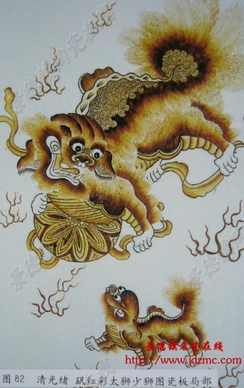 图81为民国时期最为常见的红绿彩狮子纹帽筒局部,一头红狮体态健壮,头下尾上,眼大如铃,尾毛旋转如轮,极为活泼可爱。上有一绿彩小狮,下为蓝彩戏球小狮。造型夸张,虽画工不精,但民间狮子舞的韵味浓郁,另侧有墨书“时属丙辰仲夏”字样,为1916年作品。晚清时多见此纹饰器物,如图82为清光绪矾红彩太狮少狮图瓷板局部,大狮子怀抱绣球神态认真,小狮子昂首高望。狮子毛发细密,浓淡过渡自然。绘画较前者细腻,但活泼可爱的韵味不足。由此可知,民国时的写意之作多追求民间浓郁的生活气息。